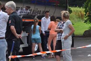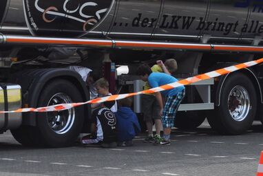 Everdings eindrucksvoller schwarzer V8 Scania war nur eine der vielen Attraktionen, die den Schülern der Rosenborn-Grundschule Harsefeld geboten wurden. Auf Einladung der SVG Stade, der Firma Weigand und der Verkehrspolizei erlebten sie am 21.07. auf dem Parkplatz der Eishalle Harsefeld einen höchst ereignis- und lehrreichen Vormittag.