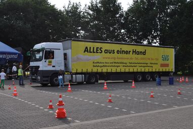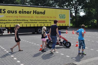 Jörg Ehlers und Bernd Klich von der SVG kümmerten sich dabei um ein besonders wichtiges Thema und zeigten eindrucksvoll, wie groß der tote Winkel für einen LKW-Fahrer ist. Die kleinen Zuschauer waren überrascht: „So kann der mich ja überhaupt nicht sehen!“ Eine Einsicht, die Leben retten kann! Und die Vertreter der SVG demonstrierten noch einen weiteren oft unterschätzten Gefahrenaspekt: „Oft beachten die anderen Verkehrsteilnehmer nur die Zugmaschine eines LKW und übersehen vor allem in Kurven die Gefahr, die vom Auflieger ausgeht.“ Die Botschaft war klar und wurde von den Kindern schnellstens umgesetzt: „Ist doch klar! Aufpassen und Abstand halten! Und davon nicht zu knapp!“