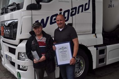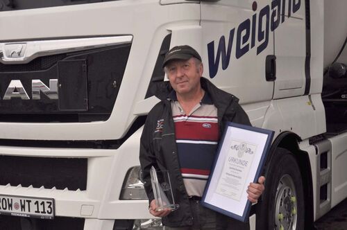 So ist der Weigand-Award eine ständige Herausforderung für Mensch und Maschine. Jeder Weigander gibt täglich sein Bestes, um diesen Preis für sich zu entscheiden. Als Preisgeld winken 500 Euro, die auf die Weigand-Ticket-Pluskarte gutgeschrieben werden, die Auszeichnung mit dem Signet Weigand-Award auf dem LKW und der Respekt der Kollegen - nicht nur bei Weigand-Transporte. Dieses Jahr konnte wieder ein MAN TGX 440 überzeugen. Dieses Jahr geht der begehrte Gewinn an Joachim Starkow. Herzlichen Glückwunsch!