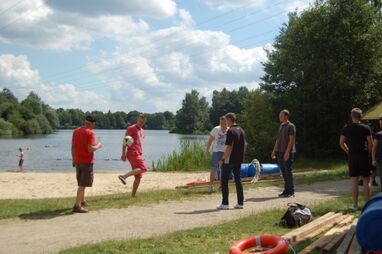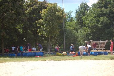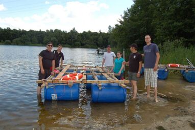 Nachdem alle nass sind und der Schatz gefunden ist, demontieren die Gruppen die Flöße und es wird mit kühlem Bier in lockeren Runden gelacht, geschnackt und gefachsimpelt.