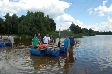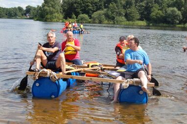 Nach kräftiger Brotzeit im Strandhaus beginnen die Mitarbeiter, in kleinen Gruppen ihr Floß zu bauen. Die Gruppen entwickeln unterschiedliche Baumuster und treten dann zu einer Floßregatta im Weichelsee an. Es ist eine super Gaudi – alle Flöße sind seetauglich und natürlich sind die meisten Floßfahrer klitschnass und teilweise gehen auch Besatzungsmitglieder über Bord. Nach der Regatta wird der Piratenschatz im Weichelsee geborgen, dafür müssen die Teams das Schokorätsel lösen und erhalten die GPS-Koordinaten vom Fundort. Ausgestattet mit GPS-Geräten stechen die Gruppen mit ihren Flößen wieder in See und machen sich auf die Schatzsuche.