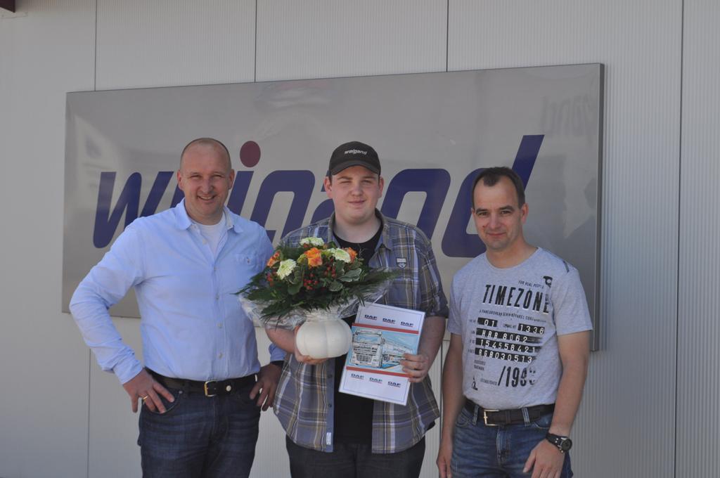 Wir sind sehr stolz über unseren erfolgreichen Ausbildungsjahrgang 2012. Nachdem im Winter schon Christian Burock und Tobias Neuendorf ihre Ausbildung mit guten Noten abgeschlossen haben, ist auch unser jüngster Auszubildender der Firmengeschichte Marco Vorwerk als dritter im Bunde den Beiden am 11.06.2015 mit Bravour gefolgt. Wir gratulieren Marco ganz herzlich und freuen uns sehr, ihn weiter in unserem Unternehmen zu halten und ihn mit einem neuen LKW, einem DAF XF 440 Super Space Cab, zu belohnen.