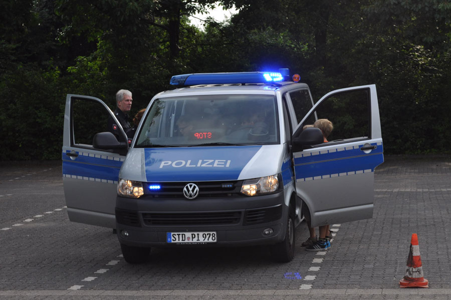 Everdings eindrucksvoller schwarzer V8 Scania war nur eine der vielen Attraktionen, die den Schülern der Rosenborn-Grundschule Harsefeld geboten wurden. Auf Einladung der SVG Stade, der Firma Weigand und der Verkehrspolizei erlebten sie am 21.07. auf dem Parkplatz der Eishalle Harsefeld einen höchst ereignis- und lehrreichen Vormittag.