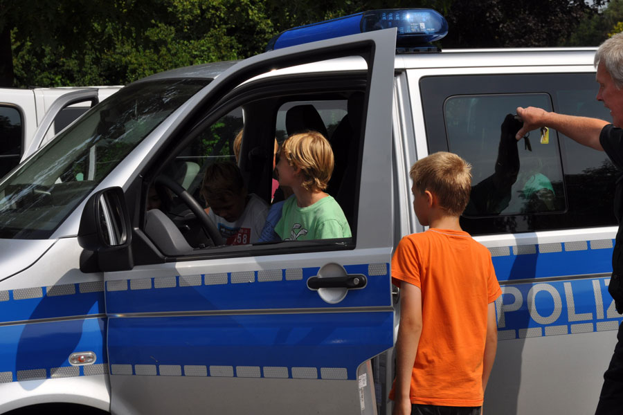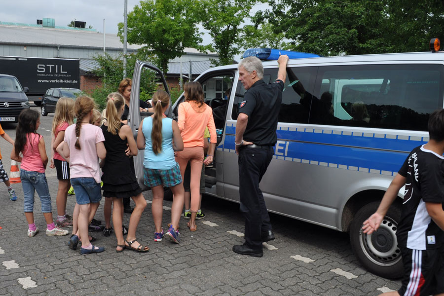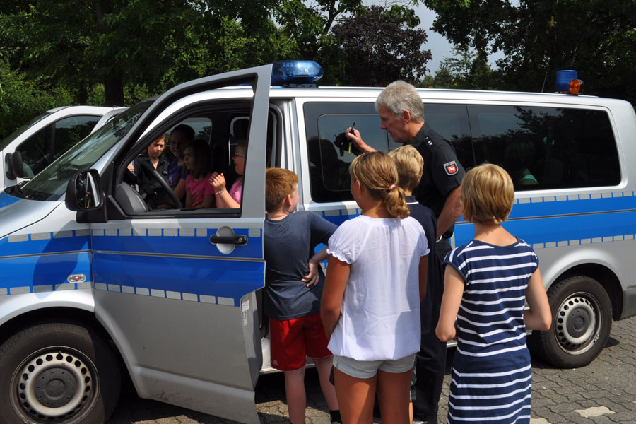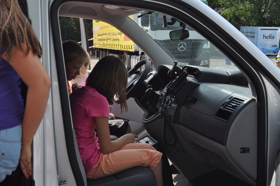 Die Beamten Groeger und Kolbe stießen ebenfalls auf großes Interesse als sie demonstrierten, wie ein Polizei-Bulli von innen aussieht. Sie führten vor, wie man eine Unfallstelle ausmisst und wie Blaulicht und Stop-Signal funktionieren. Auch hier gab es keine graue Theorie, die Schüler konnten vieles direkt ausprobieren. „Mann, ist so eine Sicherheitsweste schwer!“ war nur einer der vielen Kommentare, die die Freunde und Helfer schmunzeln ließen.