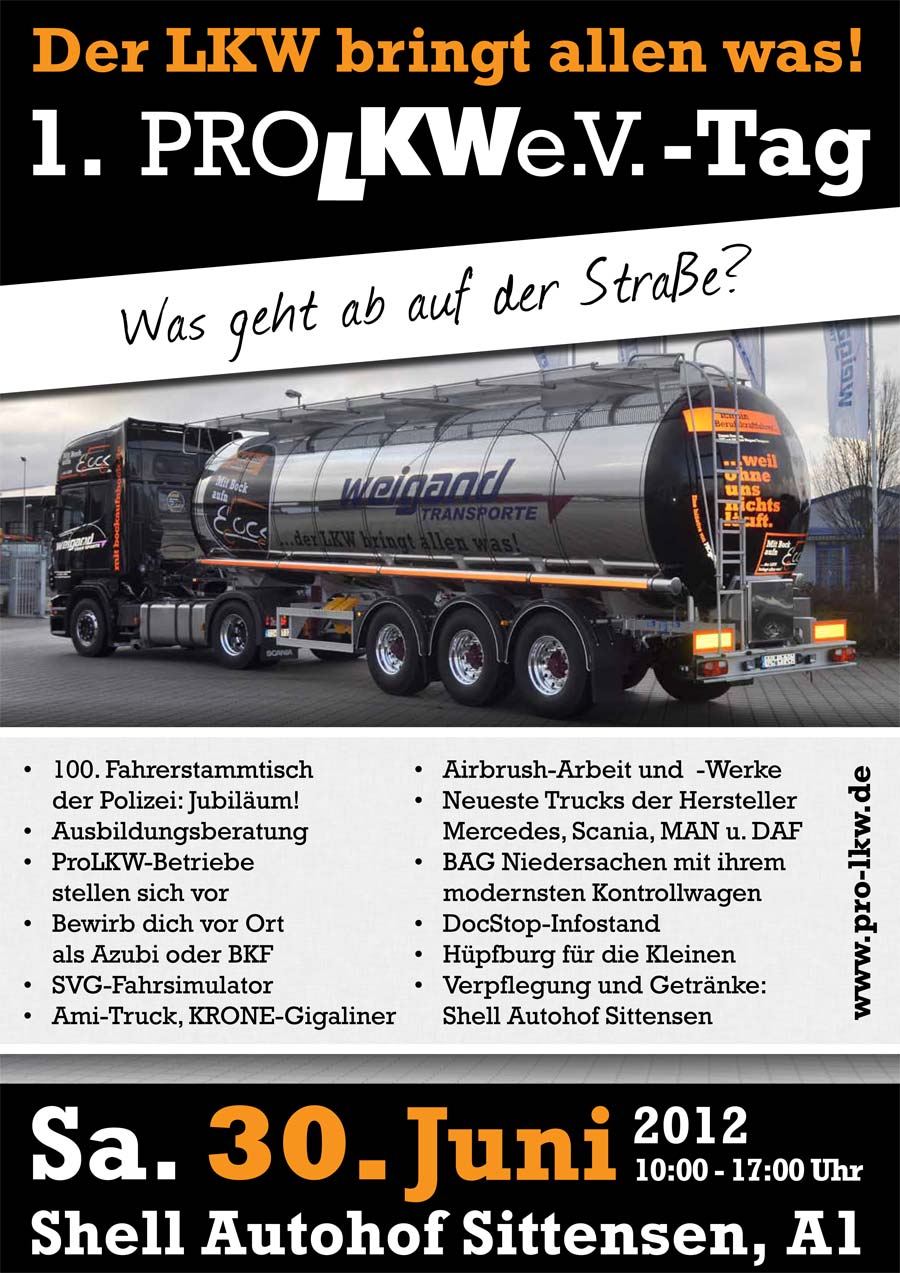 gerne laden wir Sie zum 1. ProLKW e.V.-Tag am Samstag, den 30.06.2012 von 10:00 -17:00 Uhr auf den Shell Autohof in Sittensen ein.