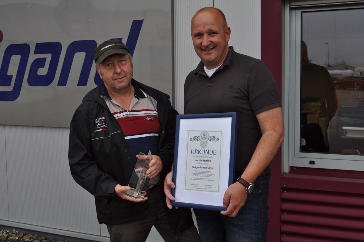 Die Geschäftsleitung gratuliert herzlich zum gewonnenen Weigand-Award und überreicht dem Weigander Joachim im feierlichen Rahmen die gerahmte Urkunde und den schönen Glaspokal des Awards 2016.