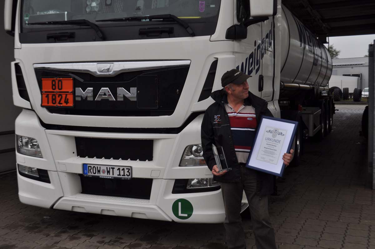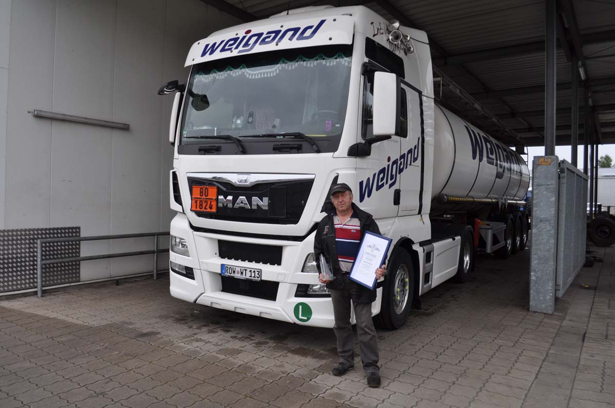 So ist der Weigand-Award eine ständige Herausforderung für Mensch und Maschine. Jeder Weigander gibt täglich sein Bestes, um diesen Preis für sich zu entscheiden. Als Preisgeld winken 500 Euro, die auf die Weigand-Ticket-Pluskarte gutgeschrieben werden, die Auszeichnung mit dem Signet Weigand-Award auf dem LKW und der Respekt der Kollegen - nicht nur bei Weigand-Transporte. Dieses Jahr konnte wieder ein MAN TGX 440 überzeugen. Dieses Jahr geht der begehrte Gewinn an Joachim Starkow. Herzlichen Glückwunsch!