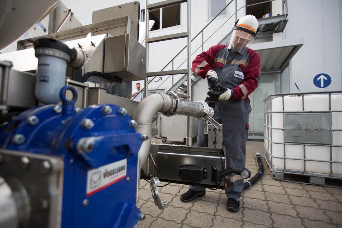 Die robuste Vogelsang-Pumpe zeichnet sich durch ihre spezielle Bauweise aus und kann auch aggressive Chemikalien und Medien mit einer hohen Viskosität pumpen. Durch die Möglichkeit zur Umkehr der Förderrichtung ist sie sowohl zum Be- als auch zum Entladen geeignet. Die Pumpe selbst ist aus Edelstahl und arbeitet mit elastomerbeschichteten Kolben. In ihrer Robustheit bietet sie einen breiten Einsatzbereich, gerade auch für Chemikalien oder in der Landwirtschaft. Selbst gröbere Verunreinigungen des zu pumpenden Materials stören die Funktion der Pumpe nicht. Dazu finden Sie ein sehr gutes Video auf der Internetseite des Herstellers, wenn Sie diesem Link folgen: http://www.vogelsang.info/de/produkte/drehkolbenpumpen/vx-serie/vx136/uebersicht/