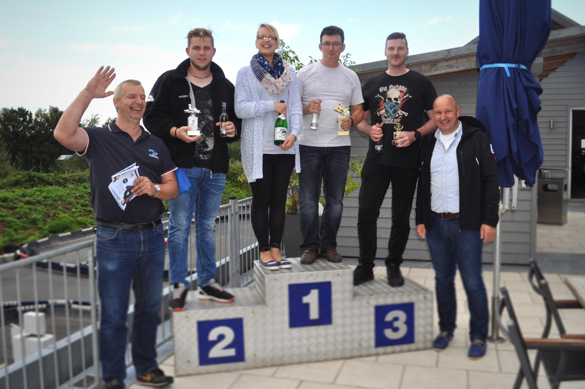 Es folgte die finale Rennrunde, bei der ein kleines und ein großes Finale bestritten werden durften. Beide Finalrunden gingen über 20 Minuten, wobei Maria Maly im kleinen Finale siegte und ihre Flasche Sekt in Empfang nehmen konnte. Olaf Tödter kommentierte auf Facebook: „Nicht zu packen, die Frau :)“ Sieger im großen Finale war Thomas Wendt, dicht gefolgt von Steve Slunitschek und Christian Exner. Anschließend versammelten sich die Mitarbeiter an der Grillhütte und auf der Aussichtsterrasse des Kartcenters bei einem guten Essen. Wer noch nicht genug Rennluft geschnuppert hatte, erhielt die Gelegenheit, mit Karsten Weigand auf 600 Metern Länge die Indoorstrecke vorbei an echten Formel 1 Boliden zu bestreiten.