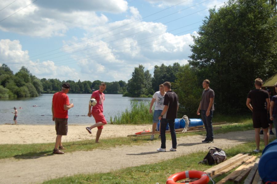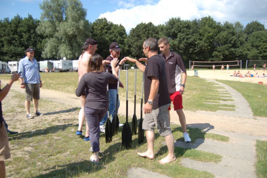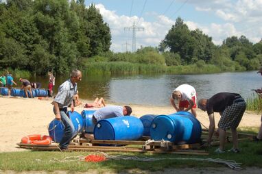 Nach kräftiger Brotzeit im Strandhaus beginnen die Mitarbeiter, in kleinen Gruppen ihr Floß zu bauen. Die Gruppen entwickeln unterschiedliche Baumuster und treten dann zu einer Floßregatta im Weichelsee an. Es ist eine super Gaudi – alle Flöße sind seetauglich und natürlich sind die meisten Floßfahrer klitschnass und teilweise gehen auch Besatzungsmitglieder über Bord. Nach der Regatta wird der Piratenschatz im Weichelsee geborgen, dafür müssen die Teams das Schokorätsel lösen und erhalten die GPS-Koordinaten vom Fundort. Ausgestattet mit GPS-Geräten stechen die Gruppen mit ihren Flößen wieder in See und machen sich auf die Schatzsuche.