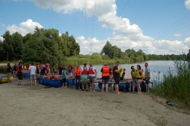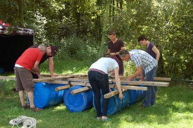 Nachdem alle nass sind und der Schatz gefunden ist, demontieren die Gruppen die Flöße und es wird mit kühlem Bier in lockeren Runden gelacht, geschnackt und gefachsimpelt.